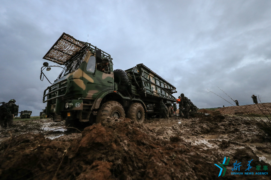 7月15日15时,“跨越-2016朱日和·A”演习正式开始。按计划,红军部队——来自东部战区第1集团军某装甲旅将从16日零时开始,在预定时间内完成360公里的战场机动。图为凌晨的一场暴雨突袭漠北草原,红方部队在泥泞路面进行架桥作业。王佳寅 摄(新华社 发)