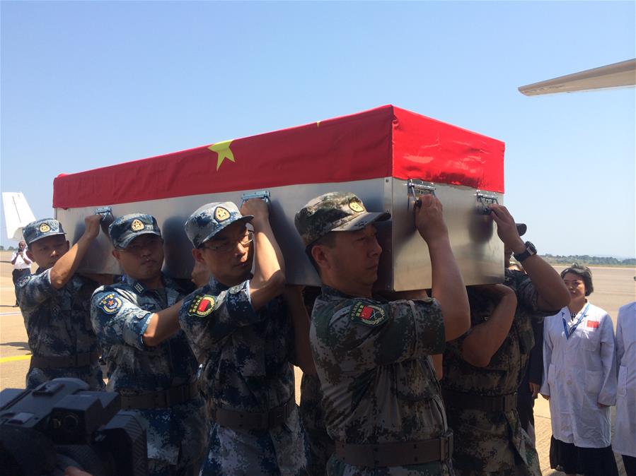 飞机起飞前,机场举行了简短而庄重的起灵仪式,中国军队工作组全体成员、中国驻乌干达使馆部分工作人员、当地中资企业商会及旅乌华侨华人代表到现场为烈士送行。