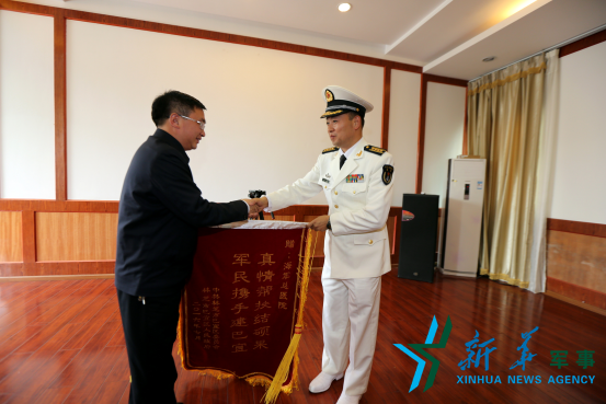 海军总医院医务部主任田光接过巴宜区赠送锦旗。毛宇摄