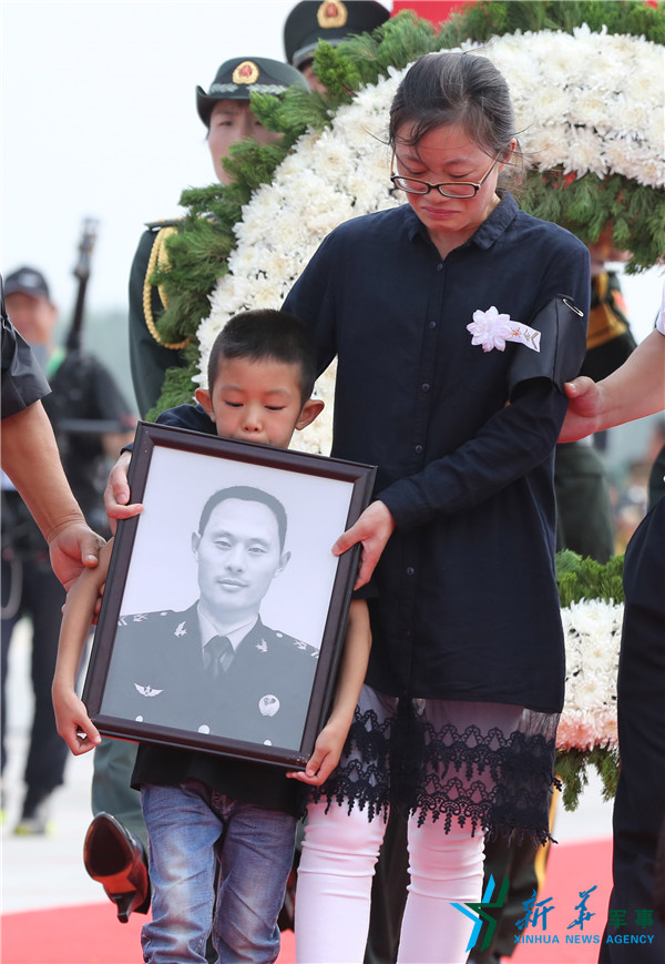 7月20日,杨树朋烈士的妻子邹丽娜、儿子杨一鸣在仪式上手捧爸爸的遗像护送灵柩。