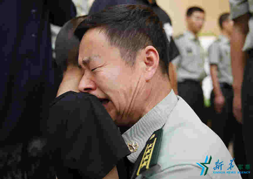 7月21日,在遗体告别仪式上,杨树朋生前战友拥抱5岁的杨一鸣。当日上午,维和烈士李磊、杨树朋遗体告别仪式上,杨树朋5岁的儿子杨一鸣仰着头,向每一个来为爸爸送别的伯伯、叔叔、阿姨问好。新华社记者殷刚摄