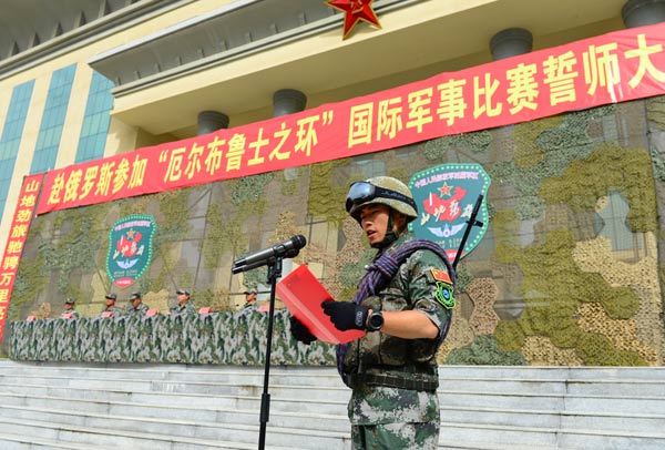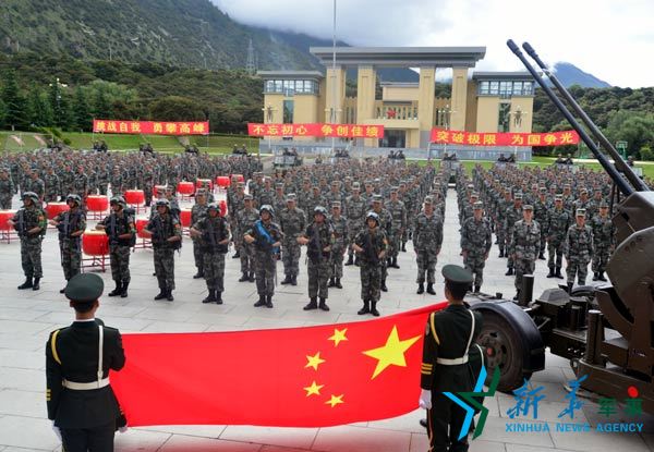 7月18日,西藏军区某旅举行出征誓师大会,图为参赛队员向国旗庄严宣誓。王强摄