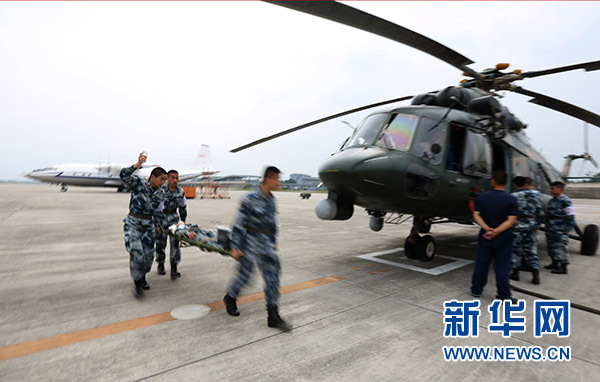 7月22日,航空兵某场站医务人员快速将“重伤员”向直升机转运。当日,西部战区空军首次组织空运医疗救护演练。此次演练,西部战区空军出动1架运输机从西北向西南转运“重伤员”,2架直升机在成都某军用机场将“重伤员”快速转运至医院。演练中,他们联合成都军区总医院、四川大学华西医院、解放军第452医院等单位军地医护人员,按照战时空运医疗救护组织程序,通过军种联合、军民联合、立体后送的形式,探索伤员空运医疗救护技战术训练模式,为打造战区空军核心应急机动后勤保障力量探索了路子。新华社发(刘应华 摄)