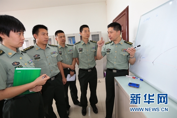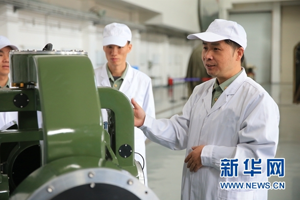 陈德明(右)在给年轻科技干部讲解某型任务参试设备性能(资料照片)。 新华社发(李玉建 摄)
