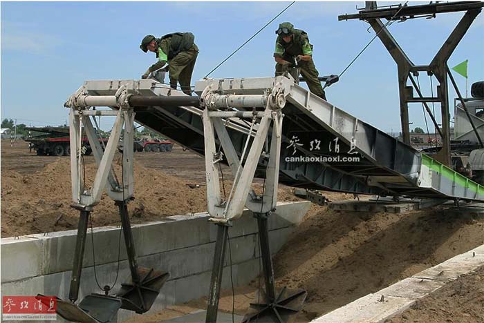 俄军工兵在桥面上展开支柱。