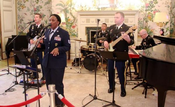 在美国大使馆于布鲁塞尔举行的独立日接待会上,SHAPE军乐团用表演吸引了人数虽少但很专注的观众,其中一对夫妇还跟着乐团演奏的《我会坚强》跳起了舞。