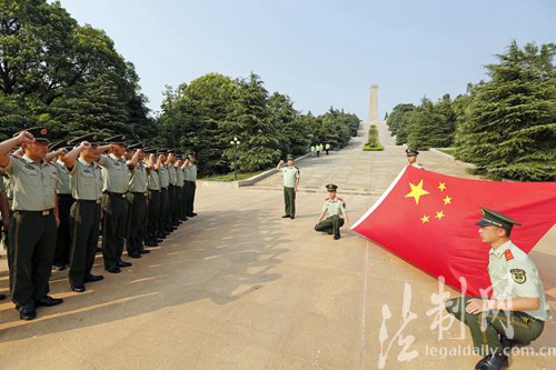 图为官兵在苏南抗战胜利纪念碑前重温入伍誓词