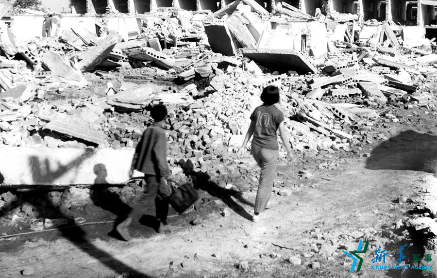 1976年,地震后的唐山。唐山体育馆一带灾情极其严重,牢固的水泥结构建筑全部趴窝。王建民