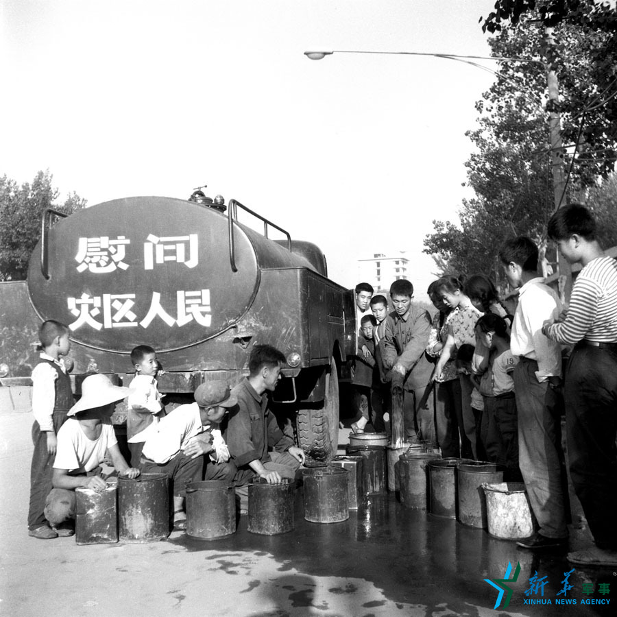 1976年,地震后的唐山。8月1日,唐山居民排队取水。大地震使唐山全城水电瘫痪,解放军及时派出给水车为灾民们送水。王建民摄