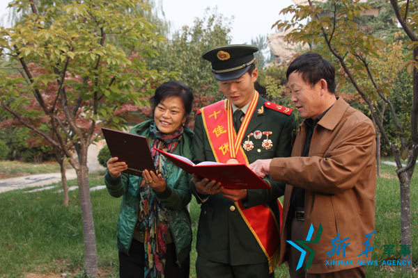 2013年10月23日,张楠同志与父母参加总队十佳优秀士官游览活动,图为张楠同志与父母合影。潘明 摄