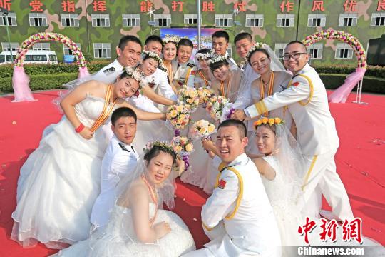 婚纱洁白,军装笔挺。8位英武帅气的新郎,脸上洋溢着激动与自豪,他们都是来自基层部队的官兵,长期驻守在条件艰苦的高山海岛,大多因战备值班任务繁重而推迟婚期。驻守在某雷达站站长张勇和妻子孙丽影2013年领取结婚证,双方父母精挑细选定在2014年10月举办婚礼。没想到,3年来,张勇先后调任两个连队担任主官,因工作繁忙三次推迟婚期。