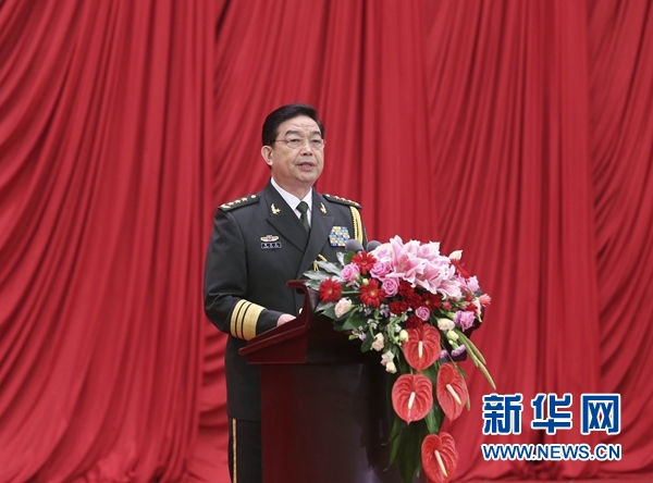 中央军委委员、国务委员兼国防部长常万全致辞。中央军委委员房峰辉、张阳、赵克石、张又侠、马晓天、魏凤和出席招待会。