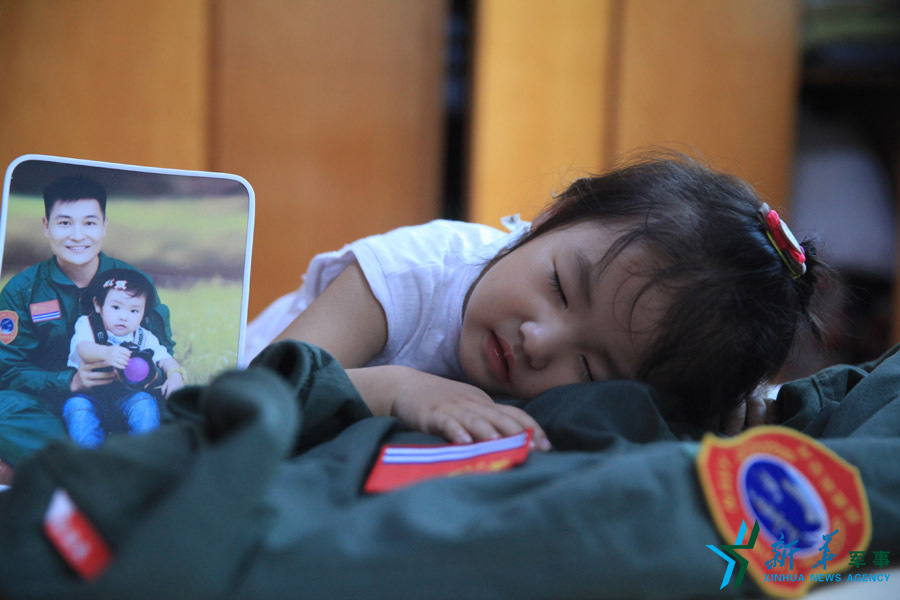 两岁的女儿轻抚在爸爸的飞行服上,假装被爸爸温暖的拥抱所包围。