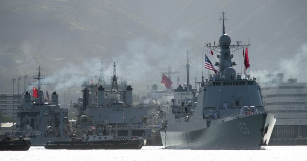 7月12日,中国海军导弹驱逐舰“西安”舰(右一)驶离美国夏威夷珍珠港。新华社记者杨磊摄