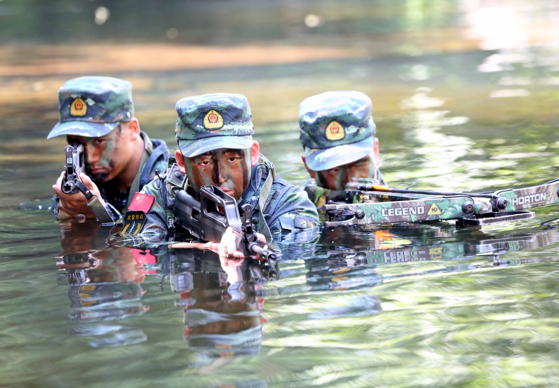 8月11日,武警烟台支队的狙击手在进行渗透训练。