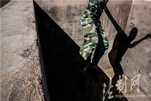图为一名战士正在通过壕沟障碍,影子倒映在墙壁上反映出战士的动作