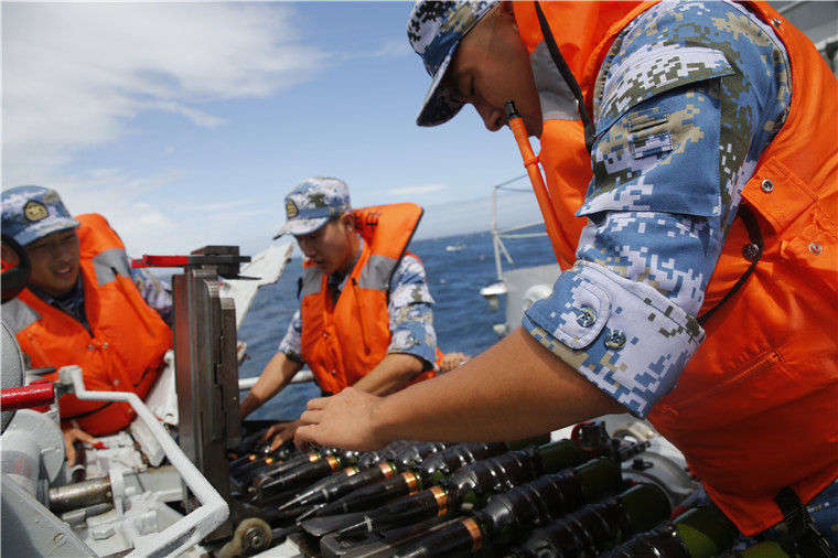 8月15日,实弹射击前官兵克服舰艇摇晃坚守在战位装填炮弹。周道先摄