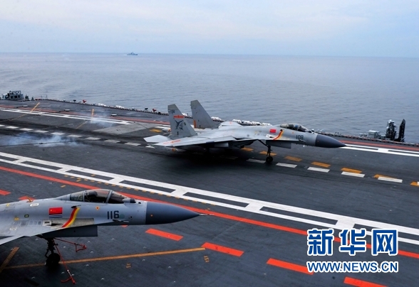 歼-15舰载战斗机在辽宁舰上进行阻拦着舰(资料照片)。 新华社发(张凯 摄)