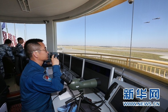 空军驻疆航空兵某旅旅长沈元中担任当日飞行塔台指挥员(8月25日摄)。 新华社发(刘应华 摄)