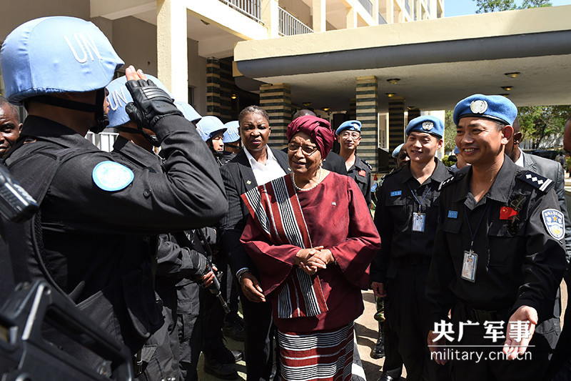 图为利比里亚总统瑟利夫看望慰问防暴队队员。(资料图)