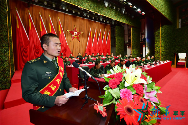 “高原戍边模范营”教导员何正海代表全营官兵发言。浦津 摄