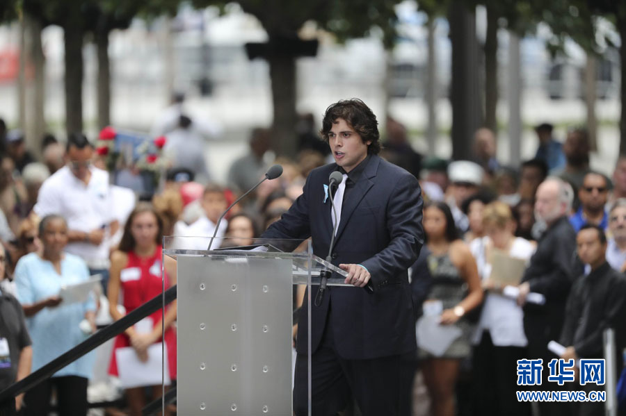 9月11日,在美国纽约,一名“9·11”恐怖袭击事件遇难者的儿子在纪念活动上宣读遇难者姓名。