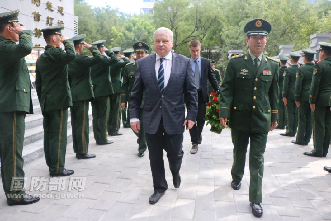 9月10日上午,俄罗斯驻华大使安德烈·杰尼索夫到武警北京总队十七支队向“英勇无畏的警卫战士”李登贵烈士雕像敬献花篮,表达对英魂的追思,对忠烈精神的敬仰,表达对英魂的追思,对忠烈精神的敬仰。