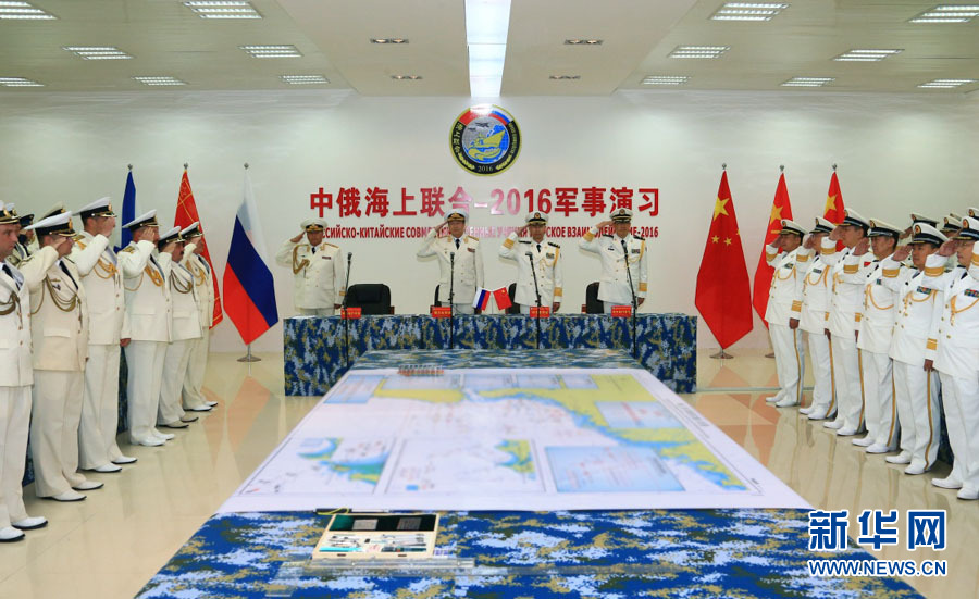 9月13日,中俄“海上联合—2016”军事演习开幕式在演习导演部举行,中方总导演、中国海军副司令员王海和俄方总导演、俄罗斯海军副司令费多坚科夫共同宣布演习开始。