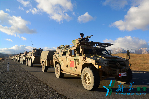 9月13日,我地面参演部队采取摩托化机动方式,于9月12日从新疆阿图什市出发,经吐尔尕特边境口岸出境,行程共约510公里,于9月13日抵达演习地域。新华社记者王德思 摄