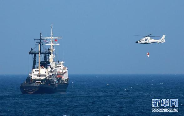 9月16日,中国海军舰载直升机对遇险商船落水人员实施救援。当日,中俄“海上联合-2016”军事演习在湛江以东海空域举行了海上联合行动演练。演练采取灵活机动的导调方式以检验参演双方的训练水平和技战术能力。演练中,中俄双方依托首次使用的中俄海上联合专用指挥信息系统,及时掌握“战场态势”,并依此快速、果断定下作战决策,严密组织攻防行动,达到了演练的检验效果。新华社记者 查春明 摄
