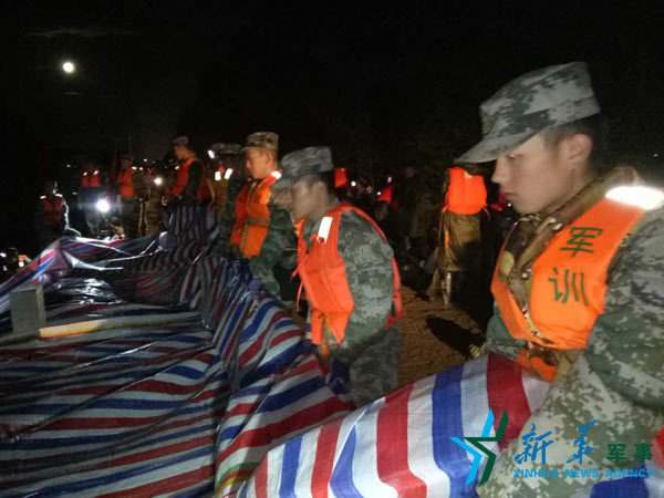 边防某团官兵星夜驰援,挑灯抗洪,封堵管涌,实施紧急抢险。段亮亮 摄