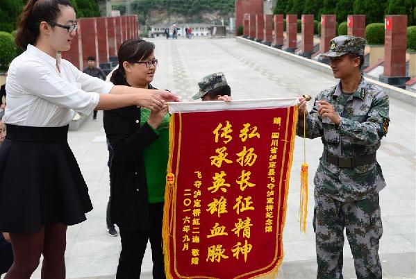 ↑9月22日,“飞夺泸定桥连”指导员司森(右一)向泸定县红军飞夺泸定桥纪念馆赠送了“弘扬长征精神,传承英雄血脉”的锦旗。 当日, 81年前以无畏勇气夺下泸定桥、创造世界军事奇迹的“飞夺泸定桥22勇士”传人——陆军第54集团军铁军师叶挺独立团红二连官兵代表再“回家”,向泸定县红军飞夺泸定桥纪念馆赠送连旗、锦旗,表达红军传人不忘初心、奋勇前进的决心和信心。新华社发