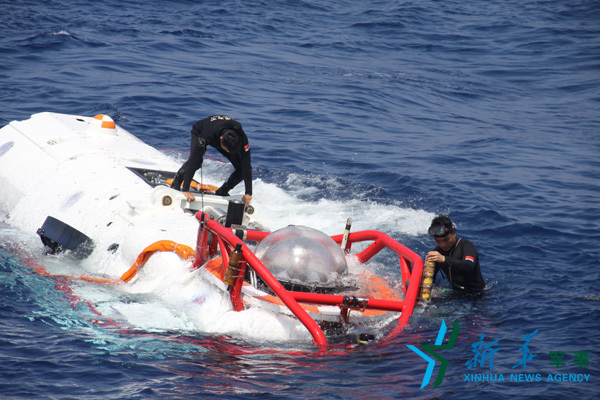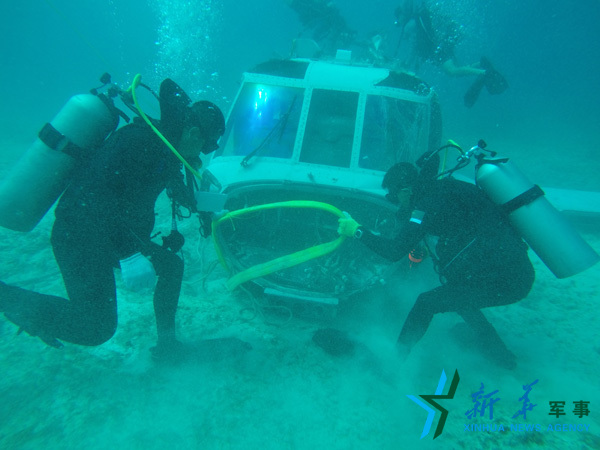 2016年7月23日,“环太平洋-2016”演习中,中方潜水员与外军潜水员联合进行水下打捞作业,这是他们对直升机进行捆绑。韩富晓 摄