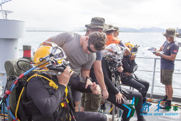2016年7月27日,“环太平洋-2016”演习中,中国与美国、加拿大、澳大利亚四国潜水员进行混合编组潜水训练,潜水员正在着装。王昶鑫 摄