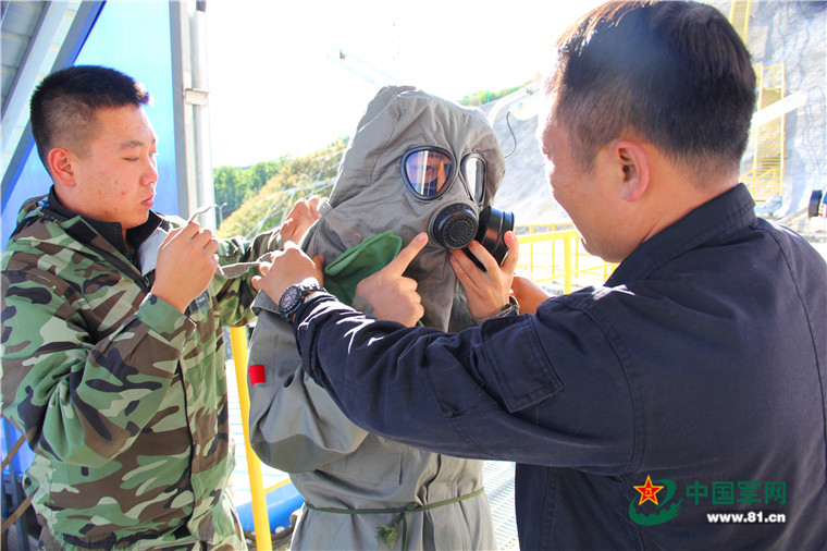 记者在专业人员帮助下穿着防毒服。周灯华 摄