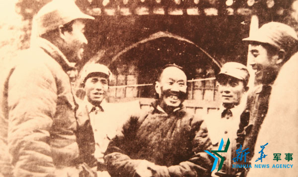 朱德、王震与开发南泥湾的顾问唐老汉亲切交谈。