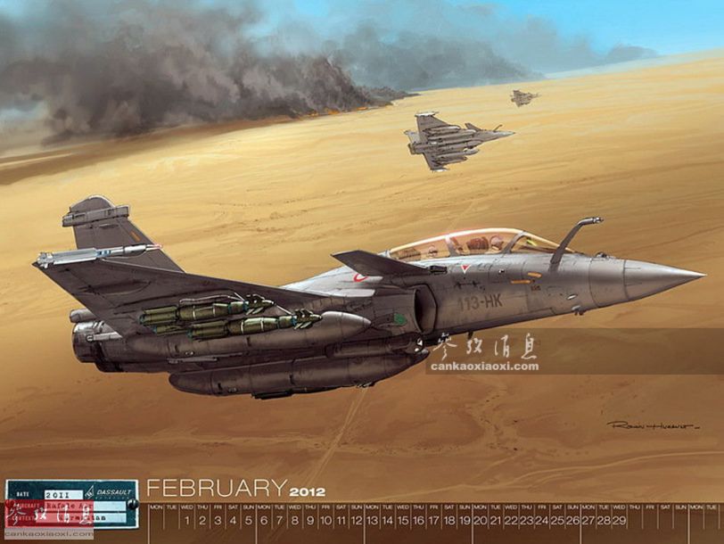本图描绘了2011年,法空军“阵风”B双座型战机打响多国空袭比利亚战争第一枪的场面,可见翼尖挂载的米卡空空导弹和翼下挂载的AASM“铁锤”空地导弹。