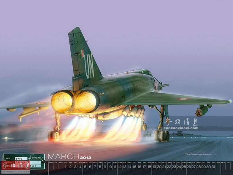 本图描绘了1991年“沙漠风暴”行动期间,法空军曾派出达索“幻影”IV战略轰炸机执行空中侦察任务。本图可见“幻影”IV启动助推火箭,实现短距起飞的壮观场面。