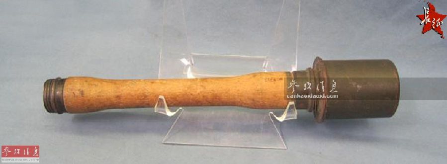 先说手榴弹。红军当时常用的手榴弹有2种——木柄手榴弹和麻尾手榴弹。其中,木柄手榴弹主要是仿自德国M1924式手榴弹(如图所示)的国产货,按照生产厂家不同又分为巩造、晋造、汉造和宁造等多个式样。
