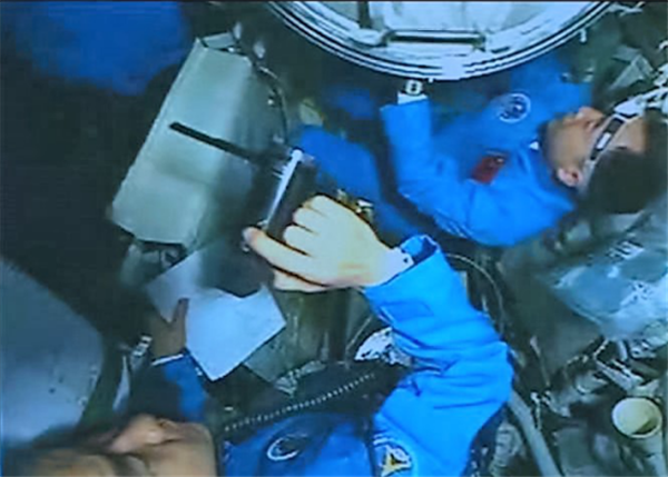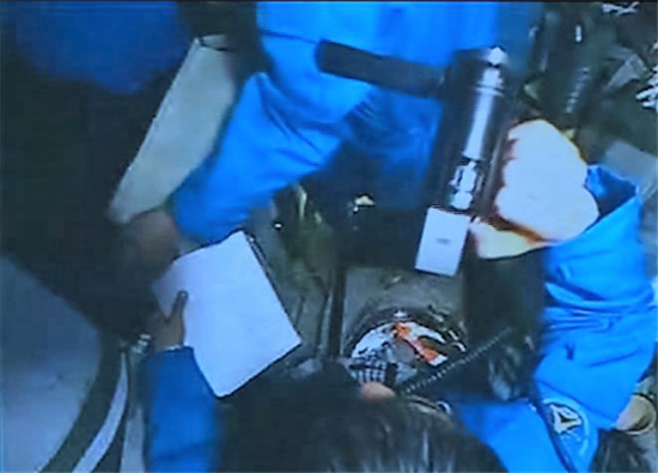 交会对接成功后,航天员准备进入天宫二号实验舱。图为航天员使用手持摄像机在神舟十一号飞船轨道舱内检查神舟十一号飞船轨道舱前舱门。(北京航天飞行控制中心大屏幕截图)