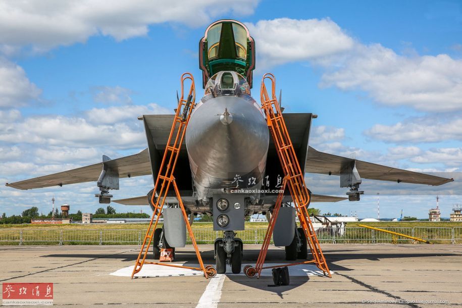 米格-31,北约代号“捕狐犬”,是一种由苏联米高扬设计局于20世纪70年代后期研发的串列双座全天侯重型截击战斗机,于1981年5月正式投入服役。米格-31是俄空军现役唯一的一种专用远程防空截击机,同时还是全球范围内飞行速度最快、起飞重量最大的战斗机。图为米格-31正面特写。