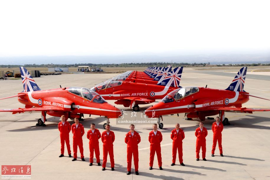1979年,红箭队换装了经典的BAE公司“鹰”(Hawk)T1高级教练机,并一直使用至今。作为表演机,“鹰”T1换装了更大功率的发动机,并加装了拉烟剂吊舱,彩烟可从尾喷管后方喷出。截至2015年底,“红箭”队已经在56个国家表演了超过4725场。图为2014年拍摄的红箭队飞行员与“鹰”T1表演机合影,可见垂尾上的50周年纪念新涂装。