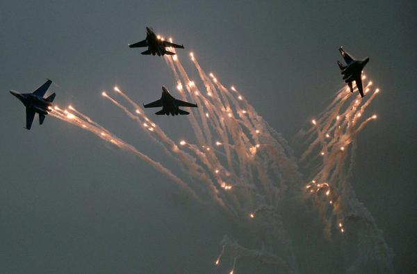 2014年11月10日,广东珠海航展上,俄罗斯空军“勇士”飞行表演队的苏-27战斗机在进行发射干扰弹表演。