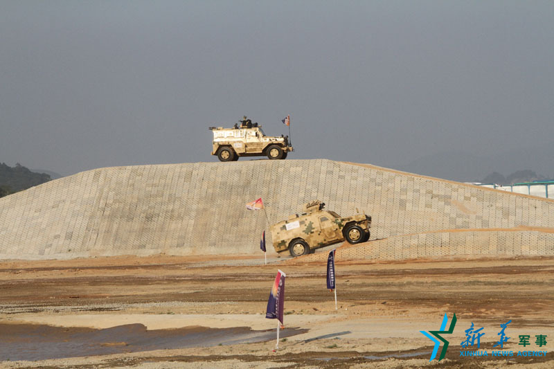VN4型4x4轮式装甲车(下)与VP11型轻型防雷车战术配合。新华社记者 蔡琳琳 摄