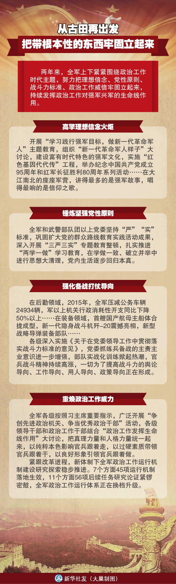 古田全军政治工作会议后政治建军有何新变化?2016年11月8日,新华社播发万字长篇通讯《书写政治建军时代篇章——古田全军政治工作会议召开两周年回望》,对两年来全军和武警部队深入学习贯彻习主席在古田全军政治工作会议上的重要讲话,以政治建军方略为引领,持续深入做好贯彻落实“下篇文章”,在高扬旗帜中凝魂聚气,在弘扬传统中正本清源,在整风整改中革除积弊的各项工作进行了全面梳理。