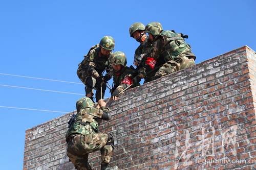 图为白山边防支队官兵在进行五人协作攀登训练