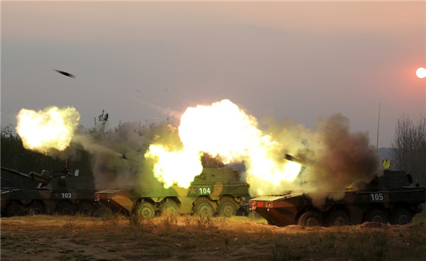 在“中部砺剑-2016·确山C”演习跨昼夜实弹演练中,参演的叶挺独立团官兵进行某型榴弹炮实弹射击(9月21日摄)。新华社发(申冬冬 摄)