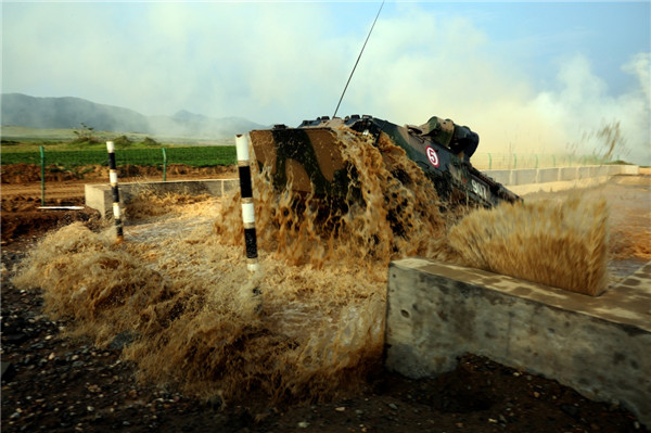 叶挺独立团参赛步战车在解放军首次组织的“中部铁拳—坦克·铁骑”竞赛中进行穿越涉水路段训练(6月21日摄)。新华社发(孙玉亮 摄)