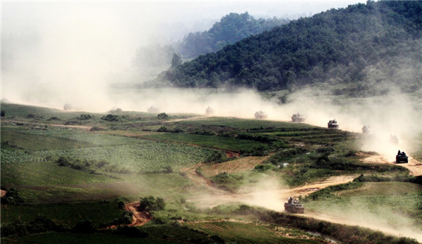 实兵演习中,叶挺独立团官兵向“敌阵地”奋勇冲击(2013年6月5日摄)。新华社发(刘健 摄)