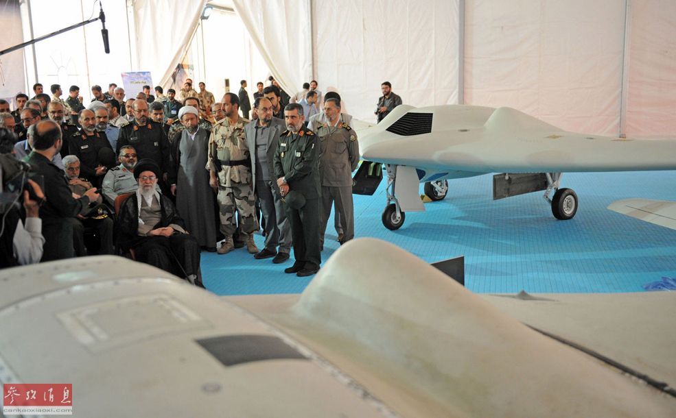 资料图:哈梅内伊出现在坠落伊境内的一架美军RQ-170高空无人侦察机及其本土仿制品前。